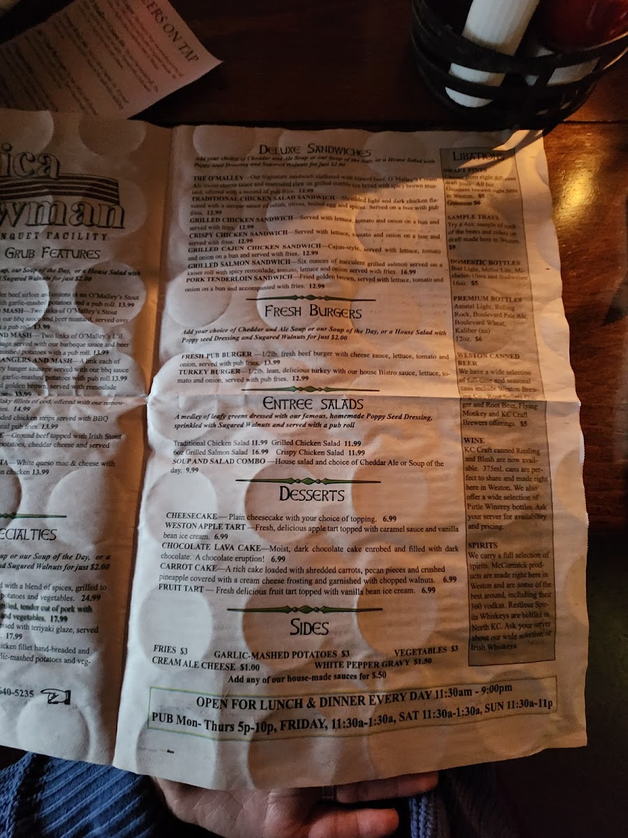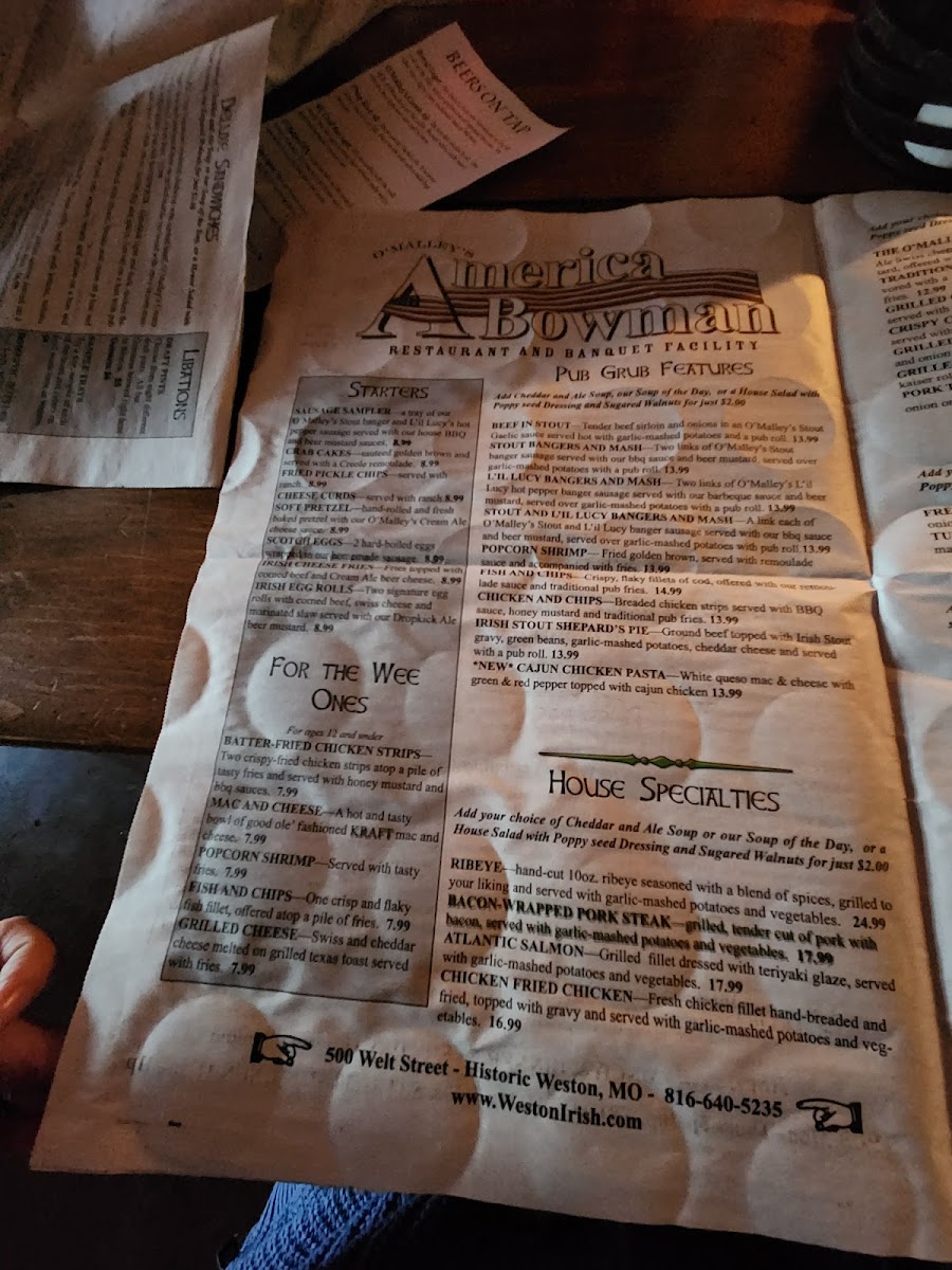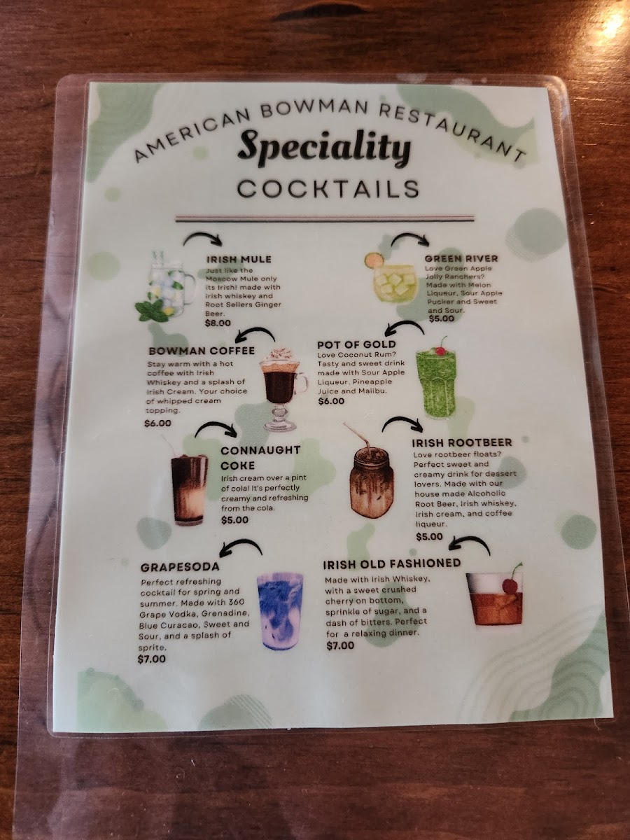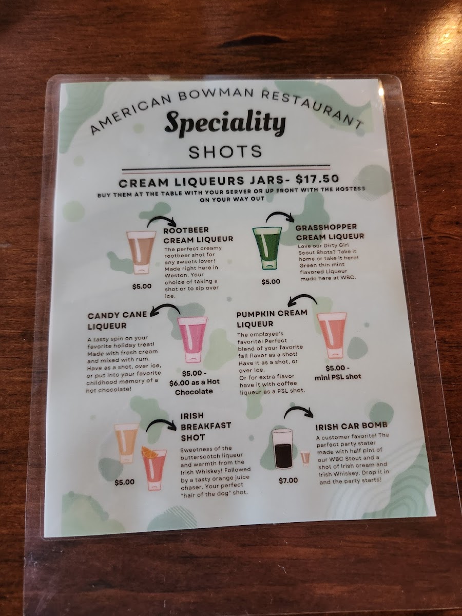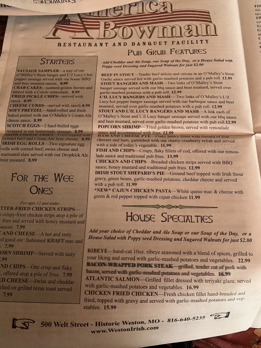 Welcome to America Bowman Restaurant, a delightful culinary gem located at 500 Welt St, Weston, MO. This inviting establishment offers a unique dining experience that combines comfort with exceptional flavors. The menu features crowd favorites such as the Cajun Grilled Chicken Sandwich, praised for its deliciousness, alongside hearty dishes like Shepherd's Pie and crispy Popcorn Shrimp. Guests appreciate the variety, including the classic Ruben Sandwich and savory Crab Cakes, while the whimsical menu design—shaped like a newspaper—adds a charming touch.